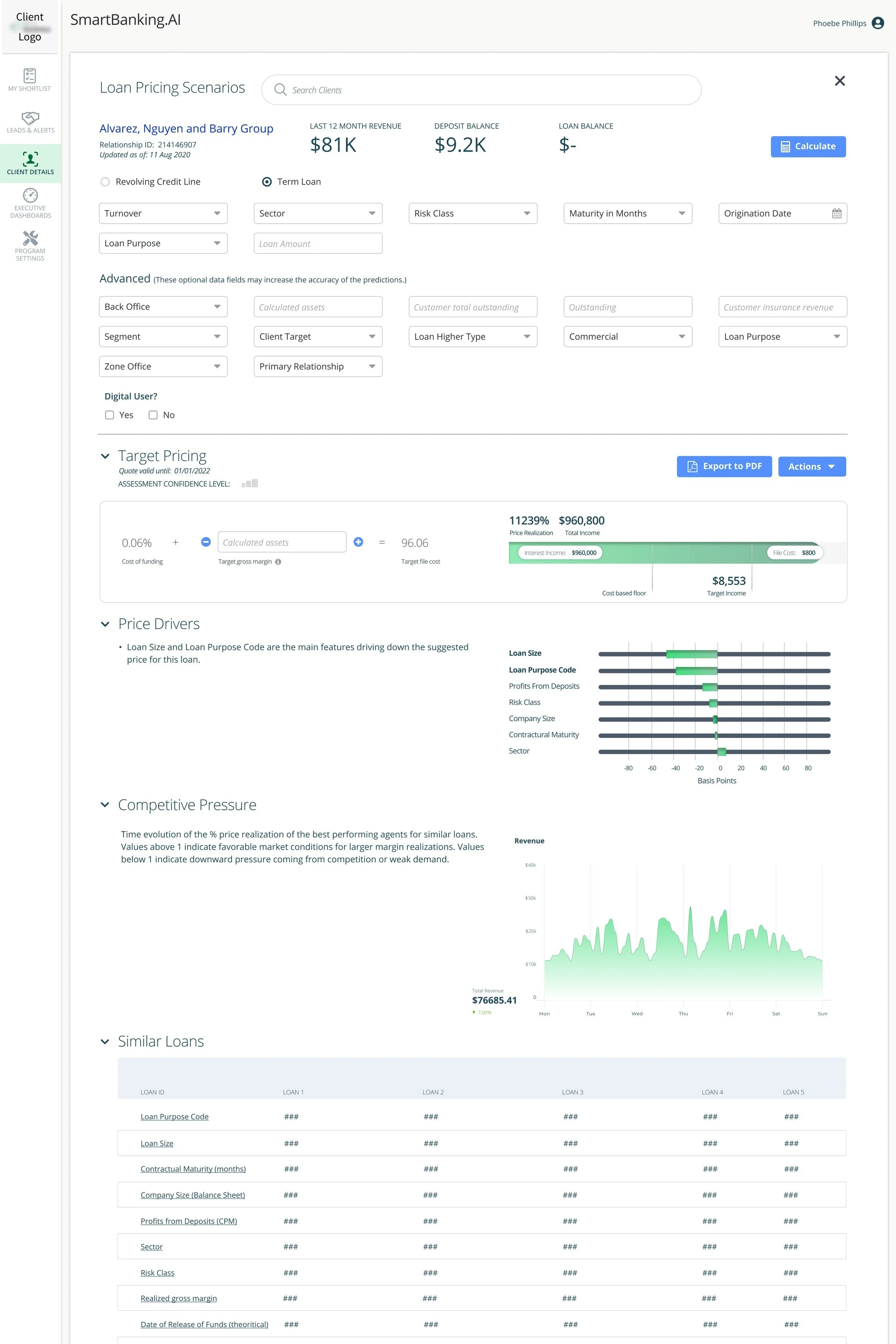 One of the main features of the Smartbanking.AI application was the ability for bankers to explore different scenarios around loan terms and pricing that used specific data about each individual person, in real-time. It effectively created personalized 1:1 targeted pricing that was optimized for both revenue generation and the probability that a customer would accept the price and terms.