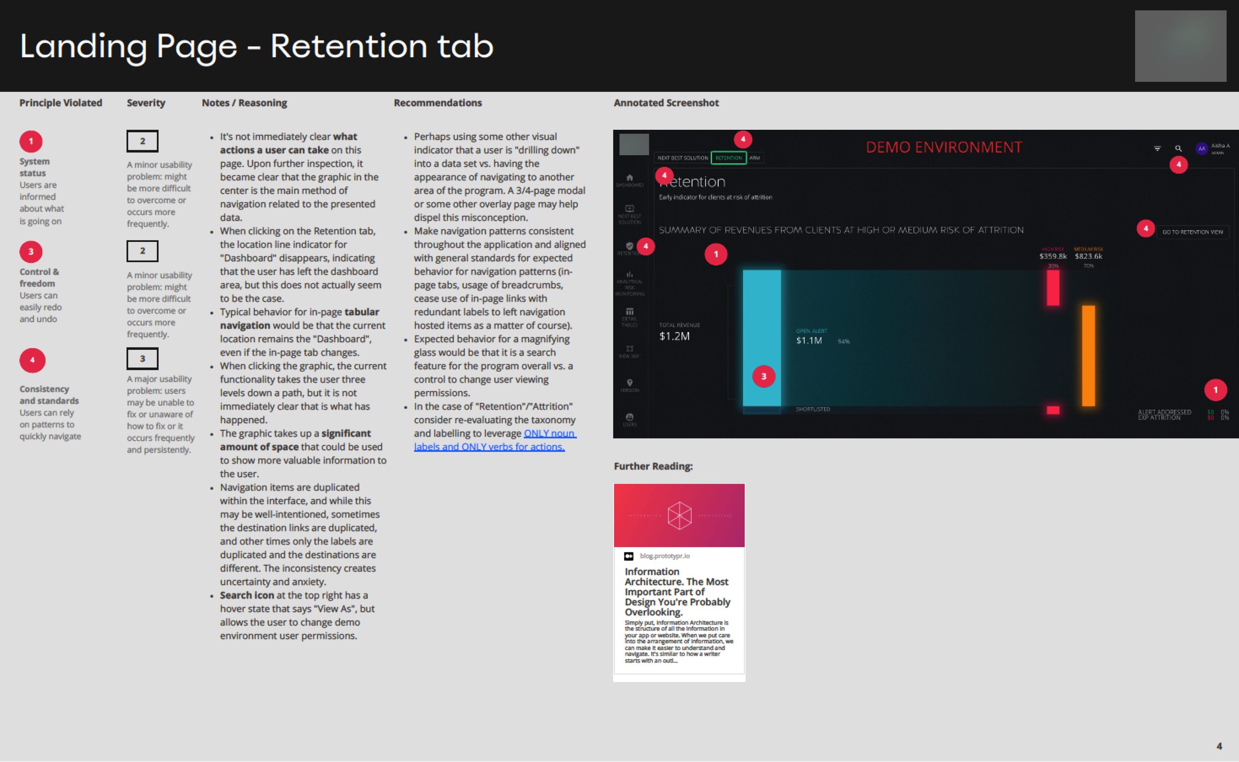 Audits, product teardowns, and experience evaluations are great ways to uncover usability issues and understand the cost implications of an existing experience or product. The outputs of this work serve as inputs for features and roadmap development for future design phases. The ten usability heuristics were used as part of the evaluation process.