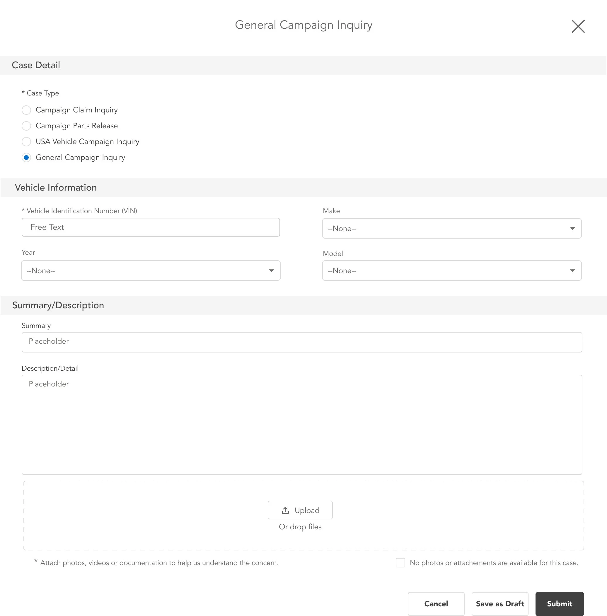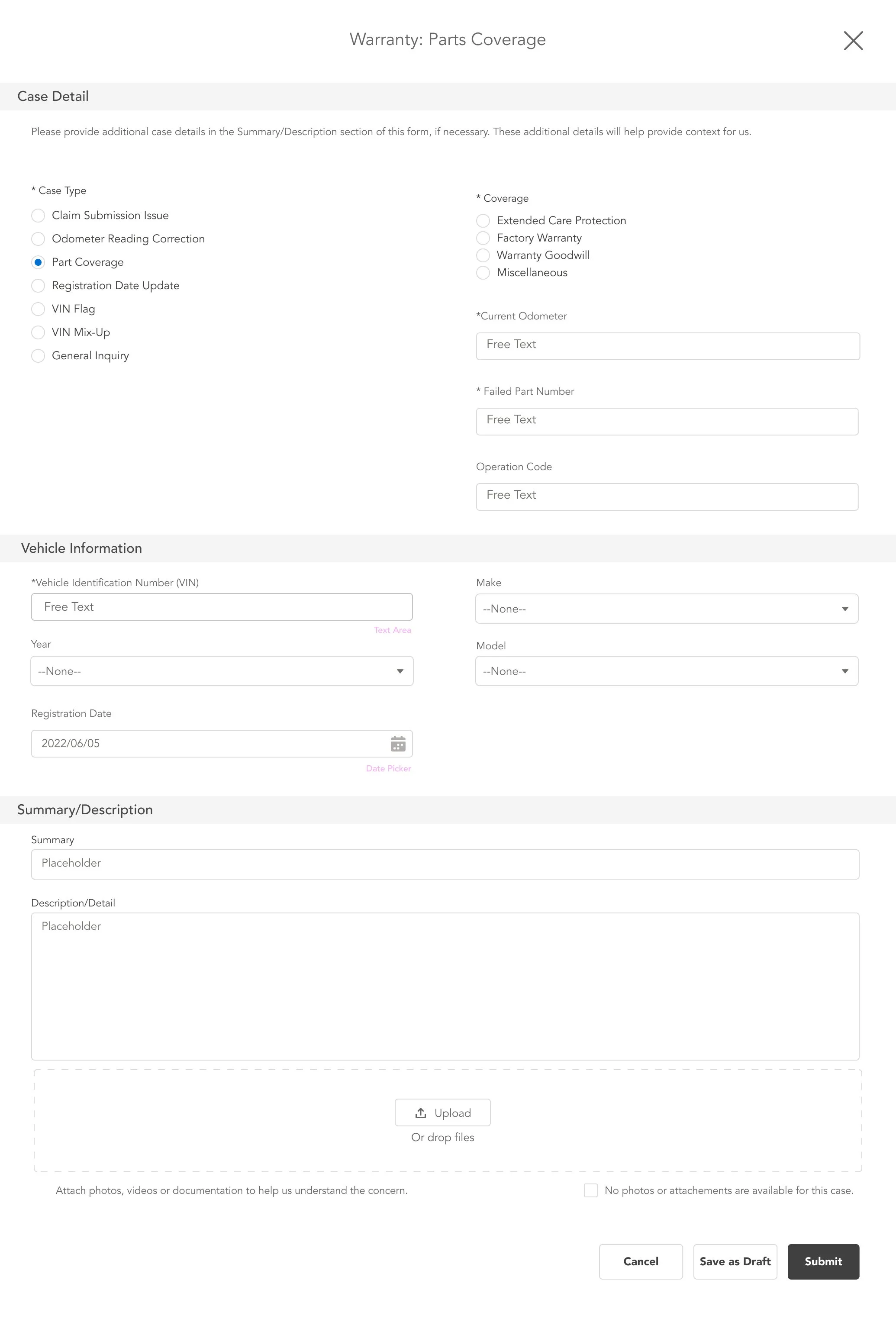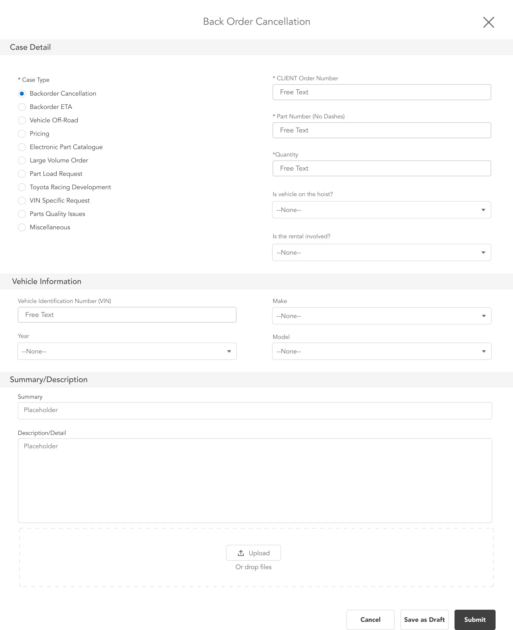 Salesforce Experience Cloud had not yet supported dynamic forms at the time, so we had to create forms with various logic in order to support the requirements of the internal business processes. As a workaround, we chose to build these forms in Omnistudio using Omniscript. Below are each of the case types and the possible permutations driven by validation rules and Flow.