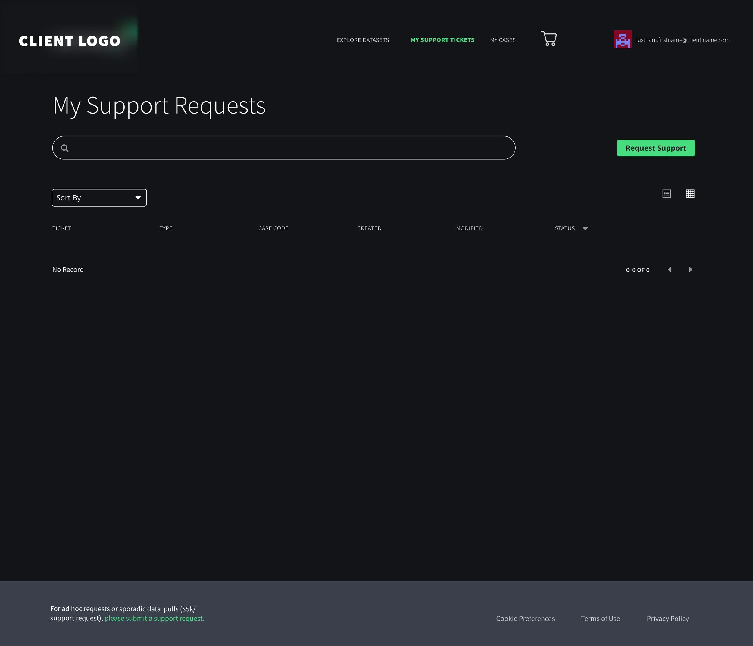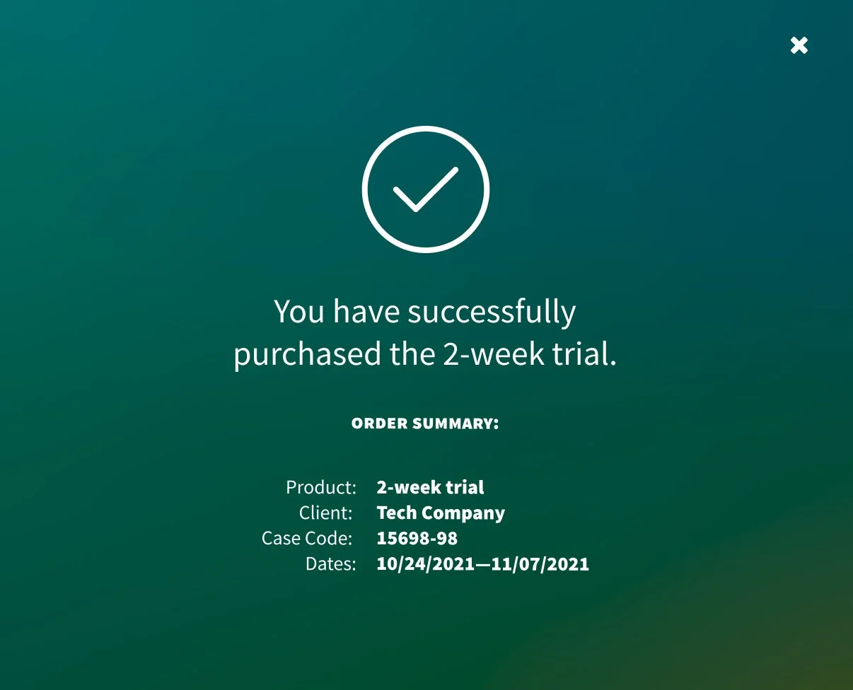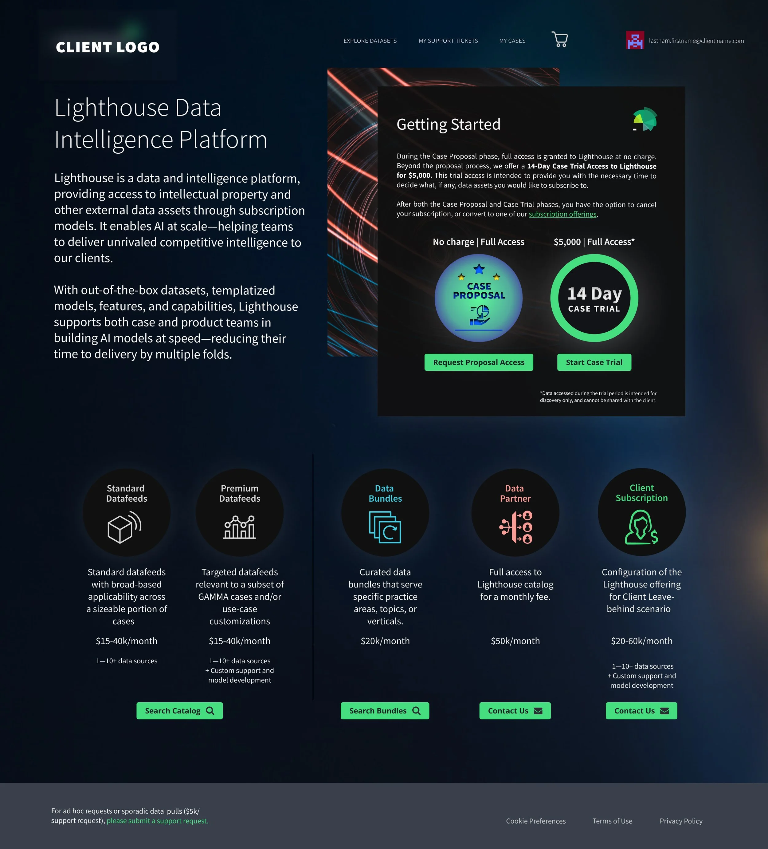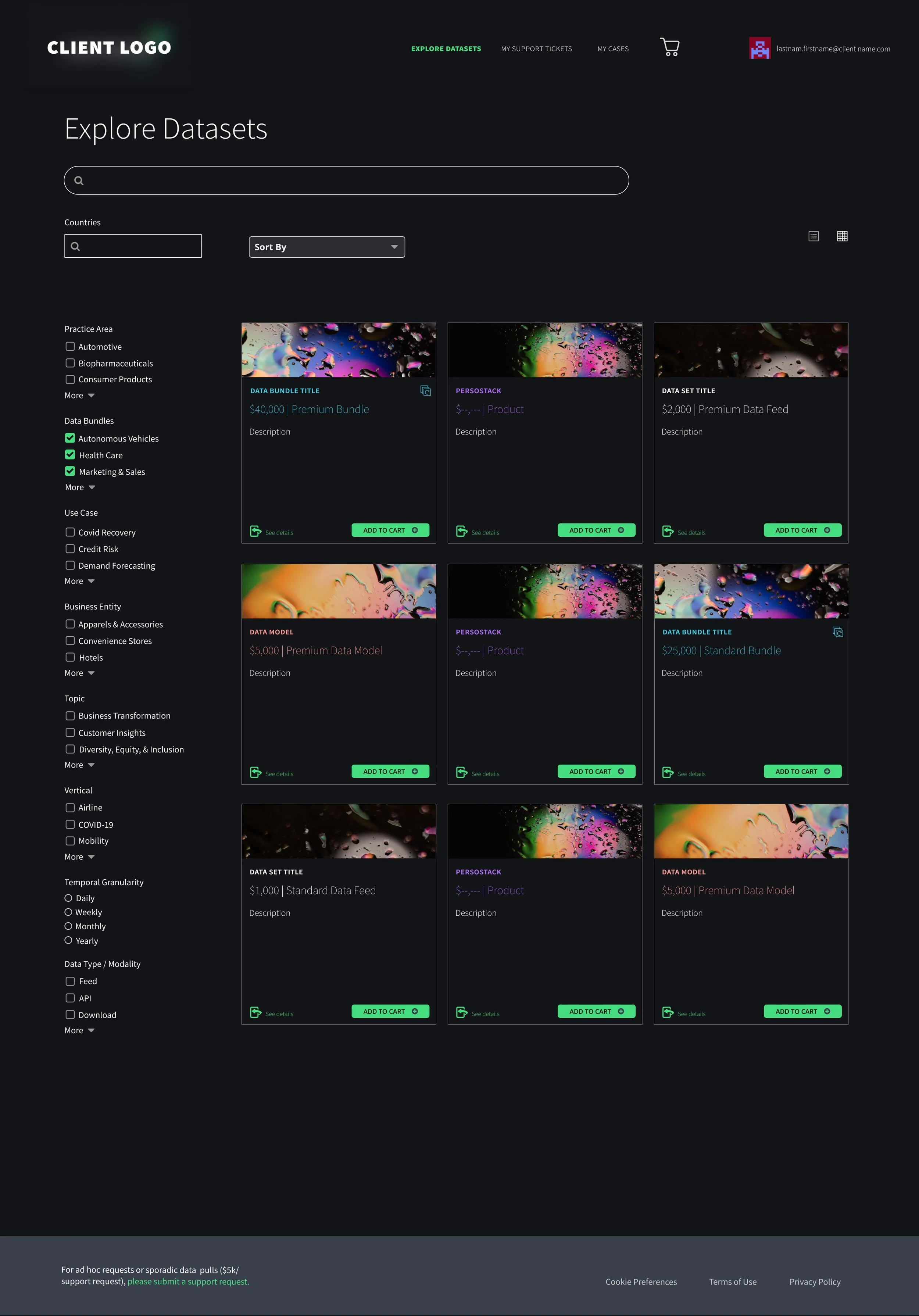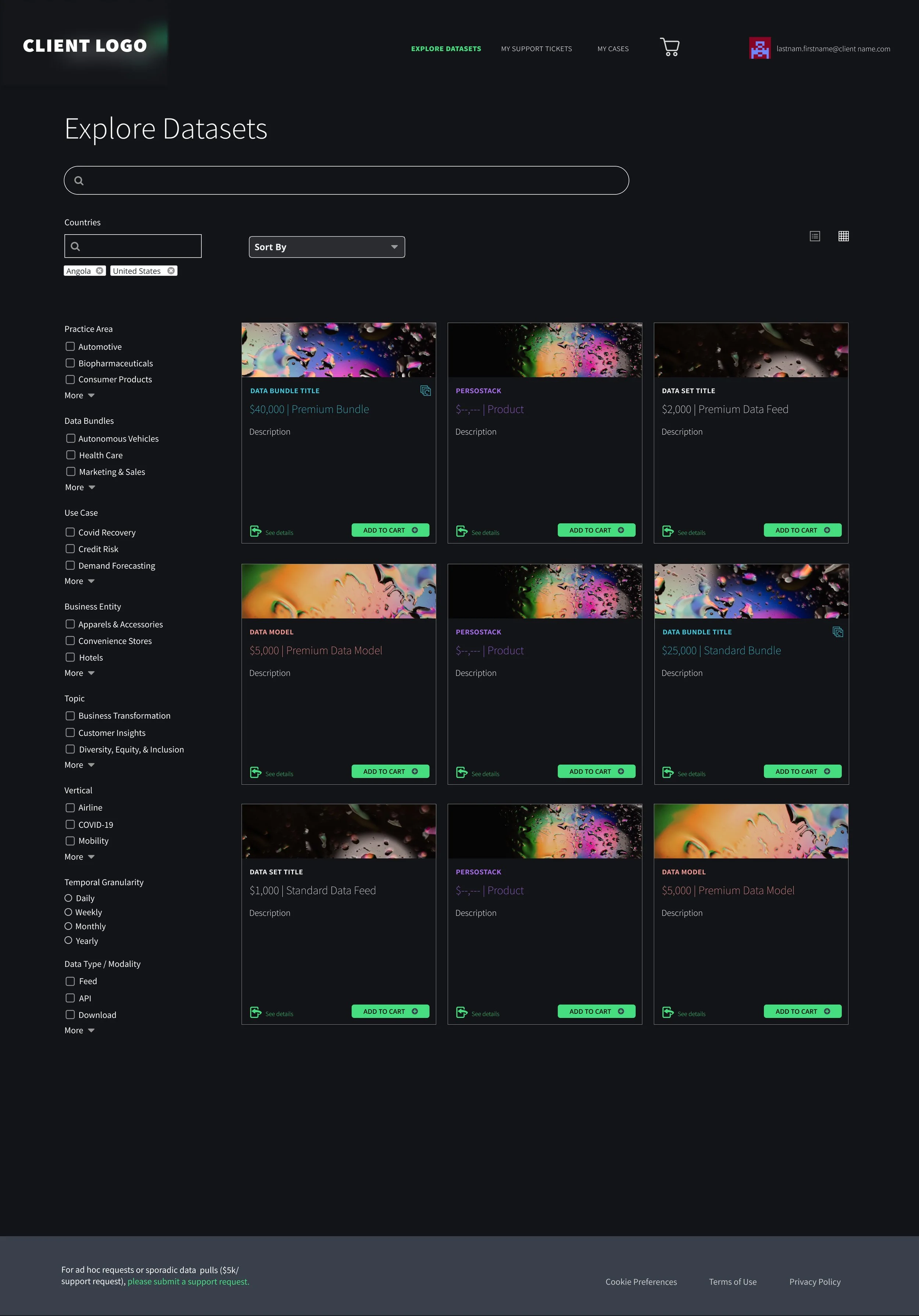 So I designed a shopping experience that would operate much like any online retailer. The experience offered a 14-day trial of the chosen data assets with the option to purchase or cancel at the end of the trial period.