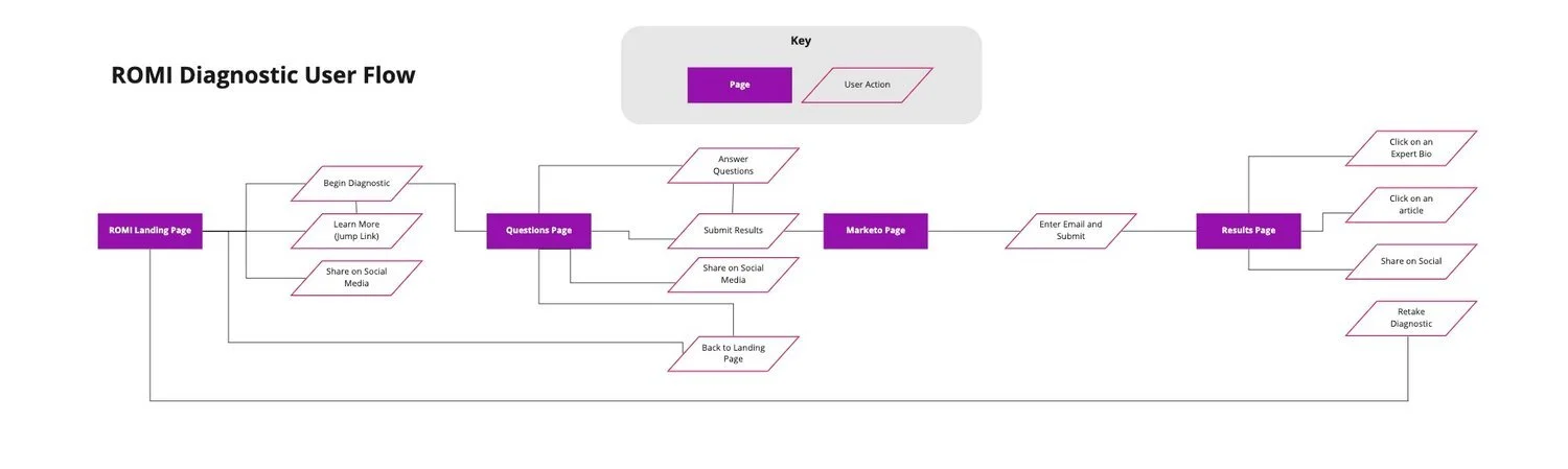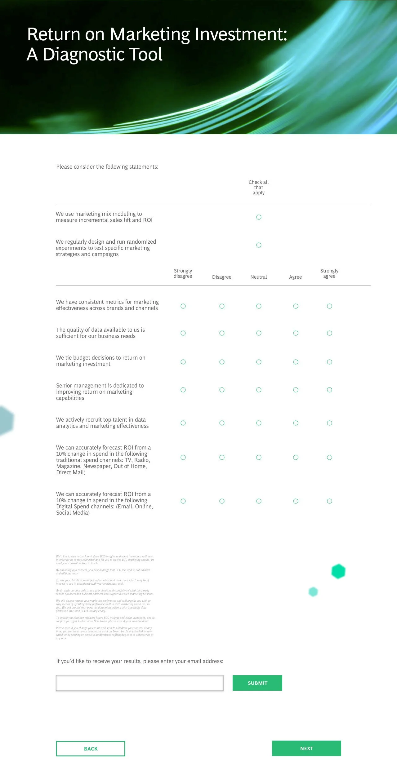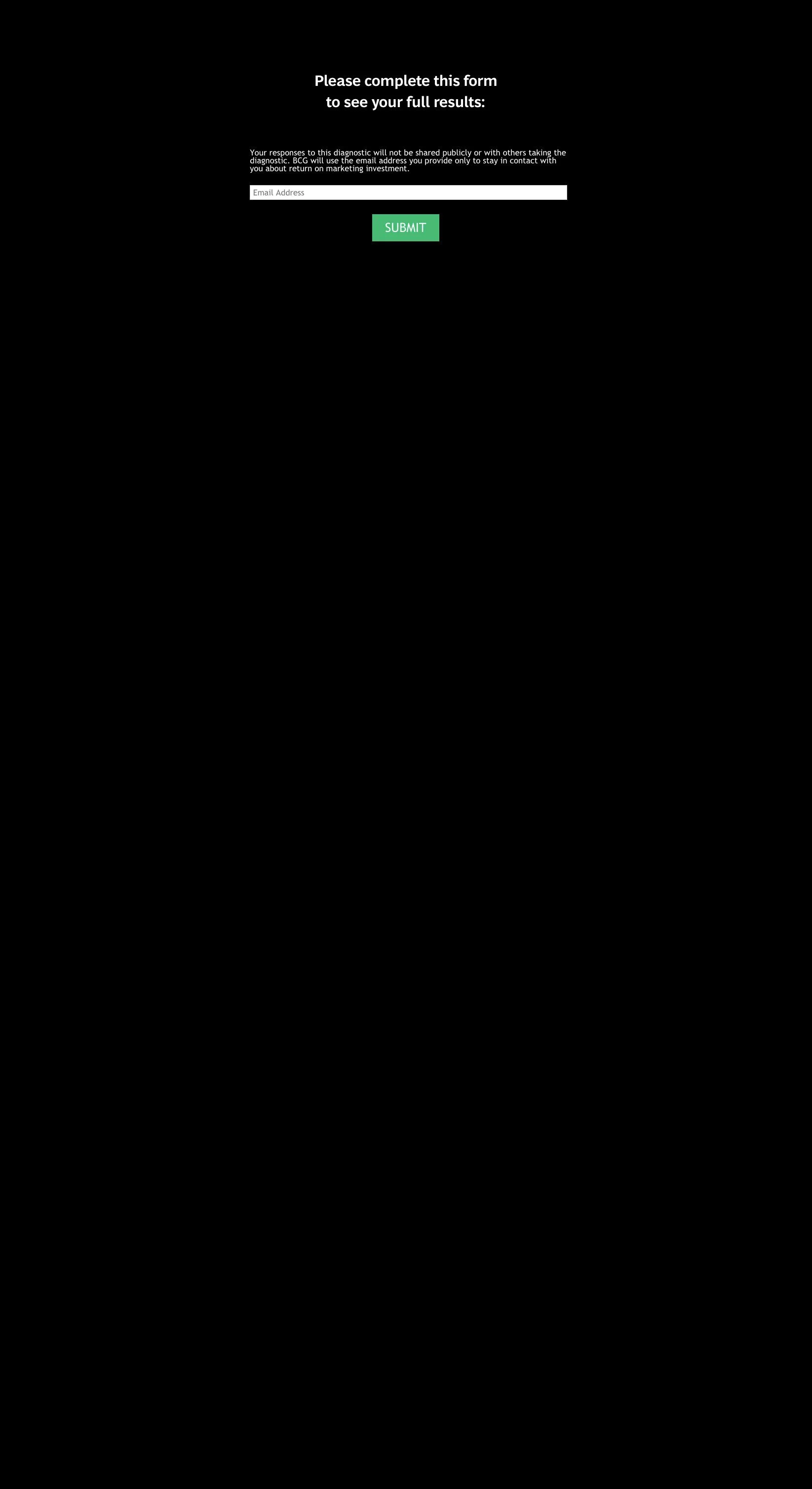 Design and produce a diagnostic tool, which would allow users to answer questions about their organization’s return on marketing investment strategies and activities. The web application would then benchmark users’ answers against the client’s proprietary database of responses built from surveying more than 100 CMOs who collectively manage nearly $20 billion in annual marketing budgets.